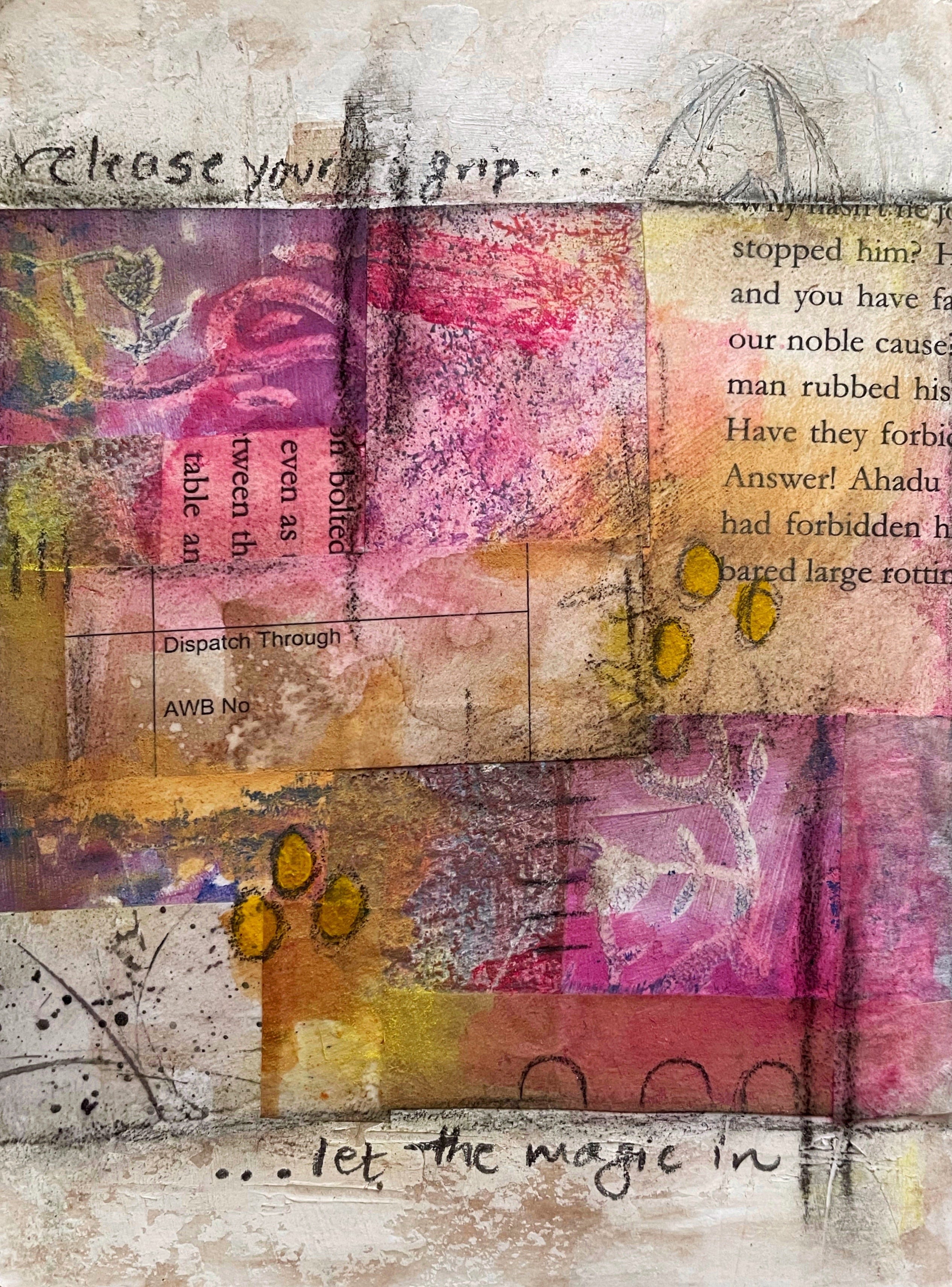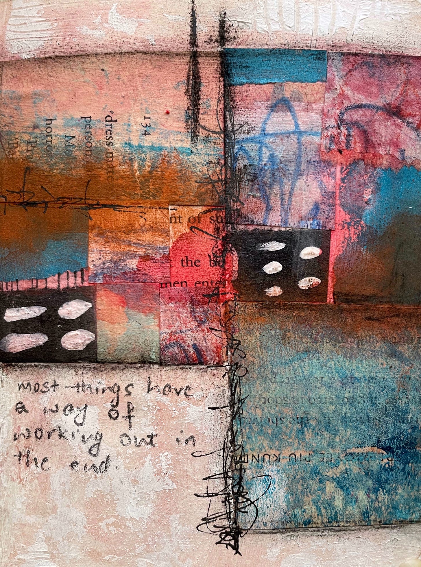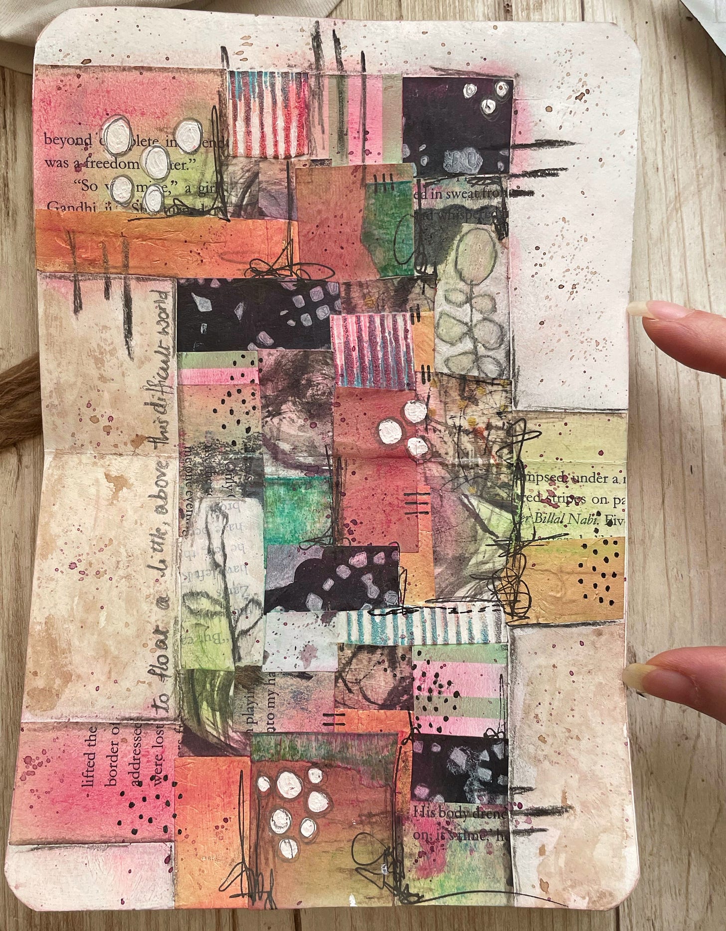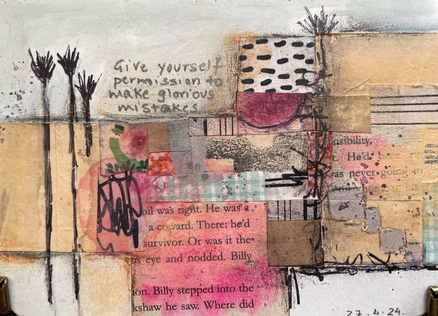 This is the very first patchwork collage in my little A6 sketchbook, with a permission slip to myself: after all, making glorious mistakes is how we learn what we love, especially with mixed media art, and perhaps also in life.
