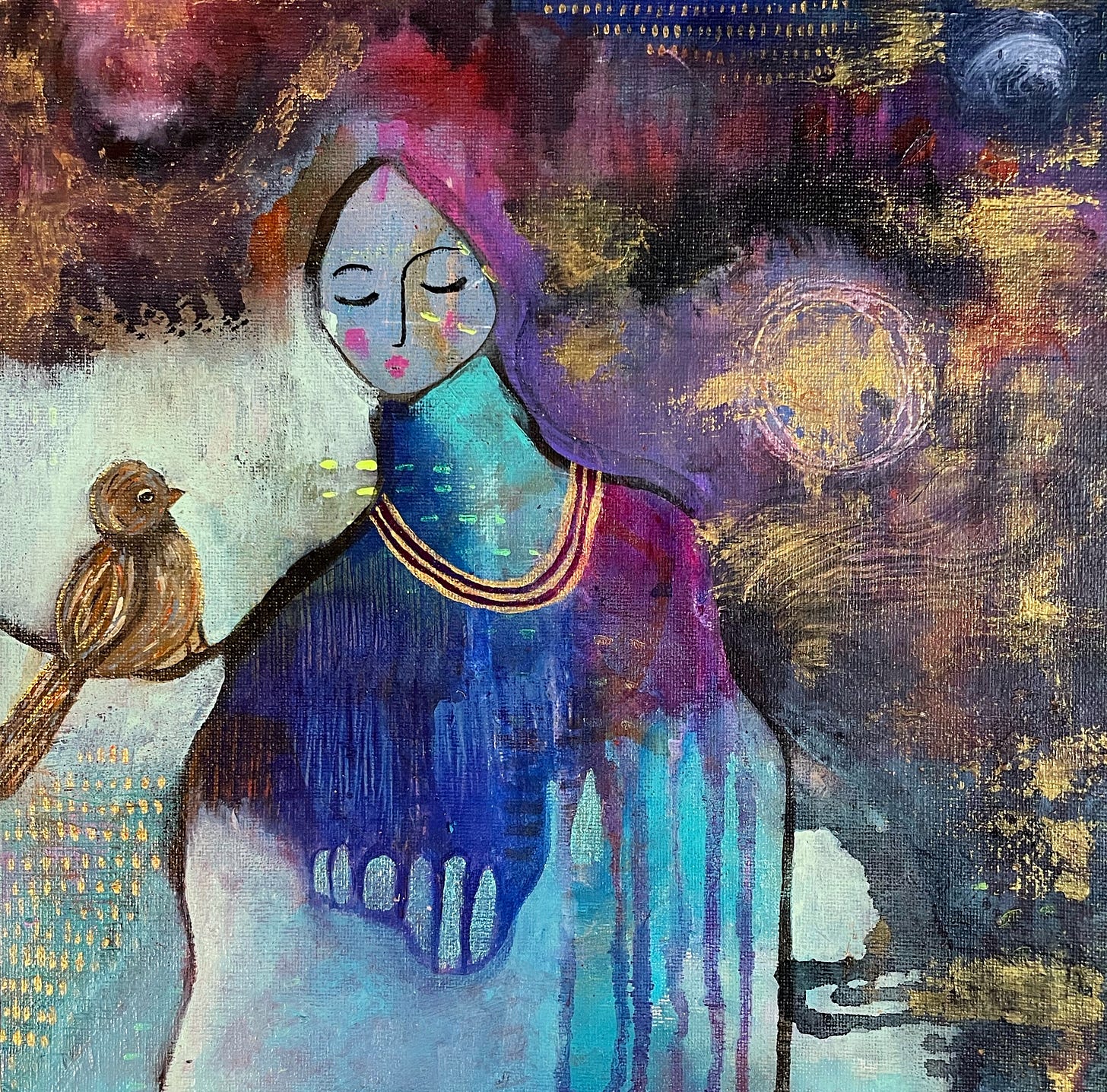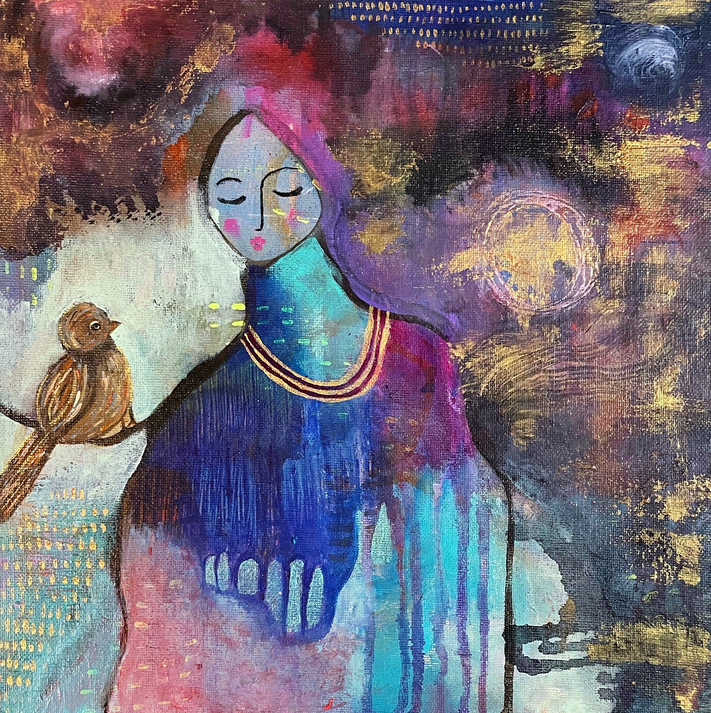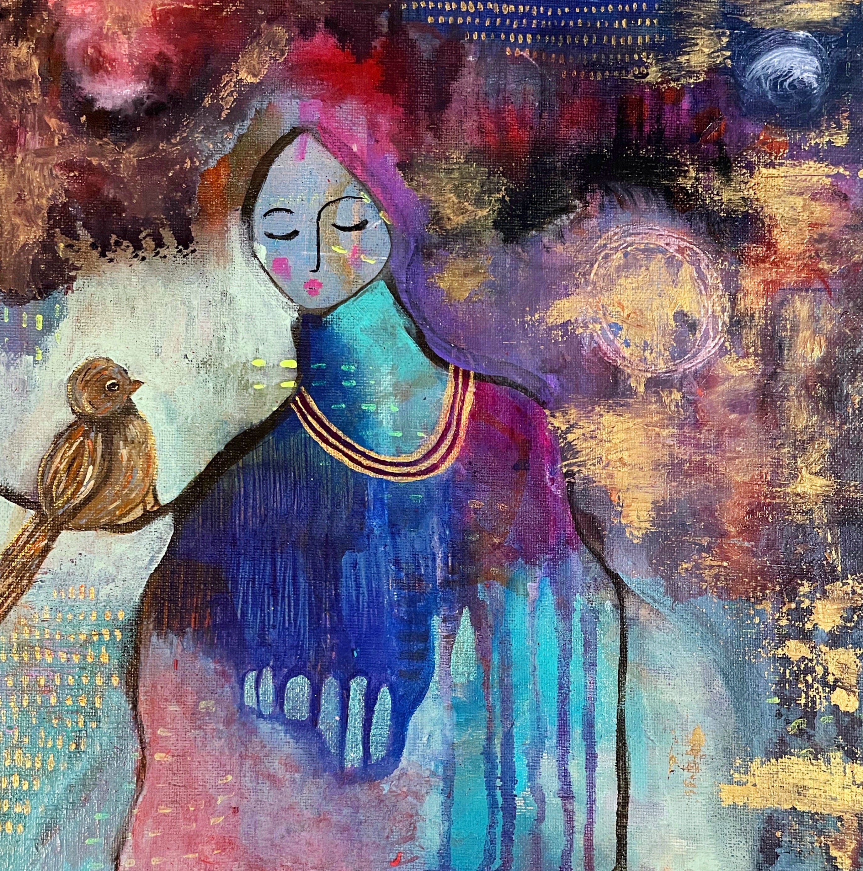And a porthole into another dimension, which I created with some silver paint. Did the lady with a gold necklace emerge from that porthole? Or is she inviting me to step into her magical world, where the brushes probably behave and the paint never muddies? Either way, it’s suspiciously sparkly business!