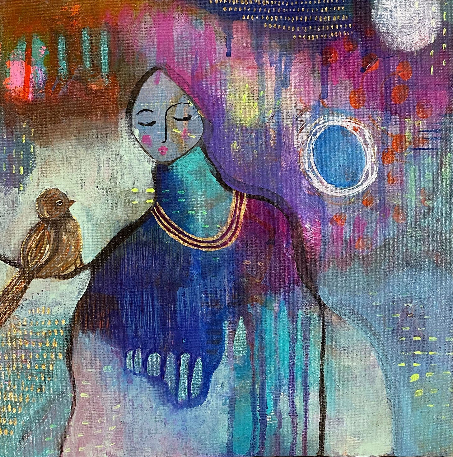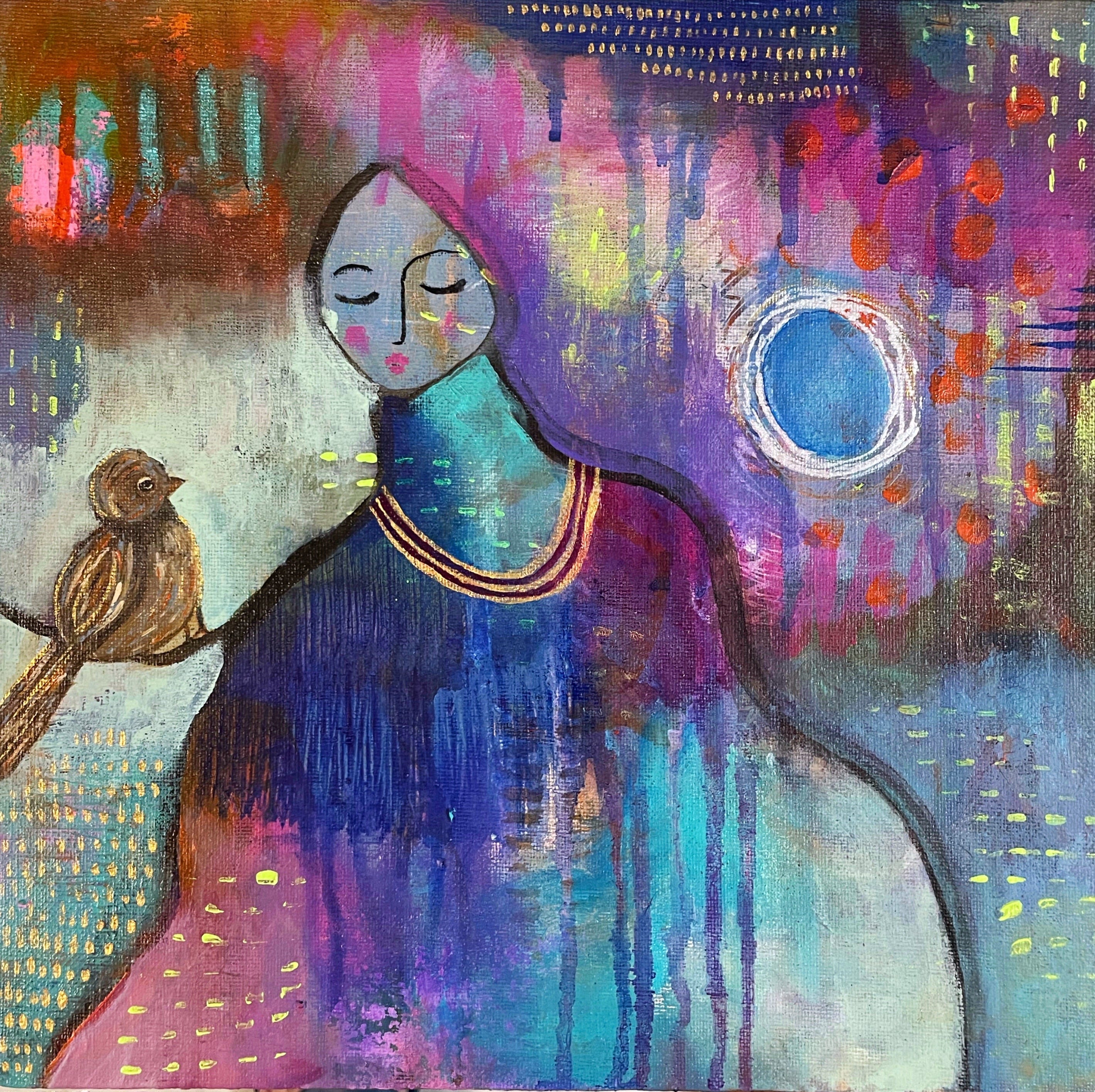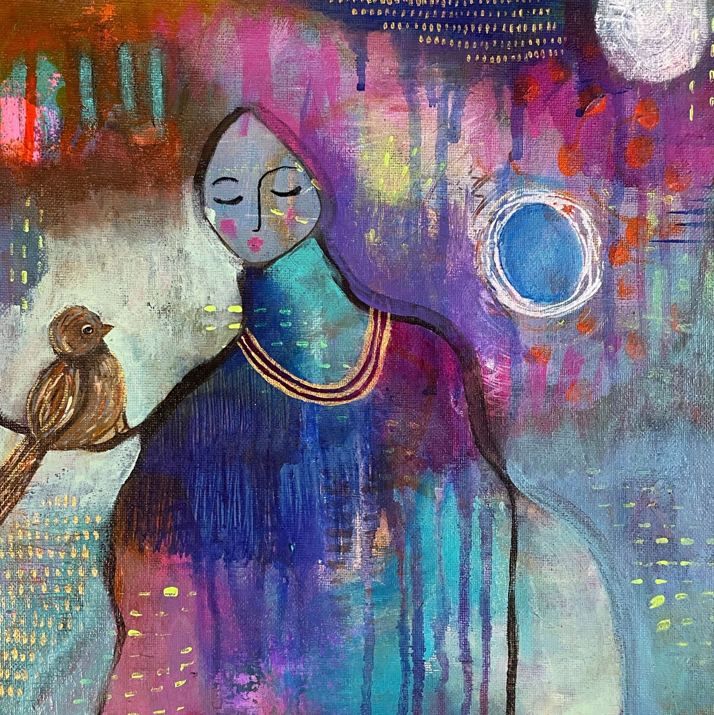 Day 18, and I was still being rather timid. I changed up some of the colors and added a few portals on the lady’s dress, hemmed and hawed while turning the canvas over every which way — north, south, and upside down — hoping inspiration would fall out. When it didn’t, I called it a day.